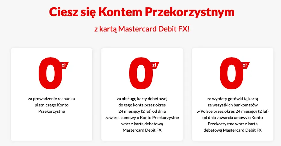 0 zł za prowadzenie Konta Przekorzystnego, obsługę karty debetowej Mastercard do konta, wypłaty gotówki tą kartą ze wszystkich bankomatów w Polsce przez okres 2 lat.