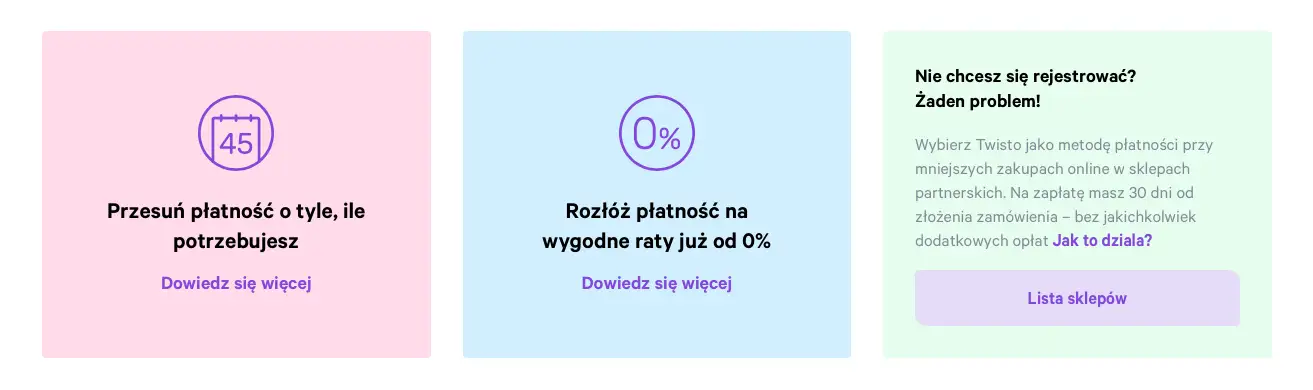 Twisto jest połączeniem karty wielowalutowej z kredytową połączone aplikacją mobilną. Daje to możliwość zapłaty za zakupy nawet do 45 dni po ich dokonaniu bez poniesienia żadnych kosztów! Dzieje się tak, dzięki przyznaniu przez Twisto indywidualnego limitu kredytowego. Więc gdy robisz zakupy, Twisto płaci za Ciebie i zmniejsza Twój limit o kwotę, która wydałeś na zakupach.