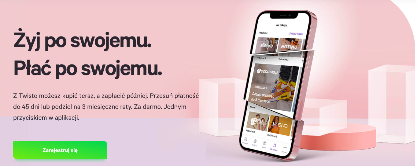 Twisto jest połączeniem karty wielowalutowej z kredytową połączone aplikacją mobilną. Daje to możliwość zapłaty za zakupy nawet do 45 dni po ich dokonaniu bez poniesienia żadnych kosztów! Dzieje się tak, dzięki przyznaniu przez Twisto indywidualnego limitu kredytowego. Więc gdy robisz zakupy, Twisto płaci za Ciebie i zmniejsza Twój limit o kwotę, która wydałeś na zakupach.