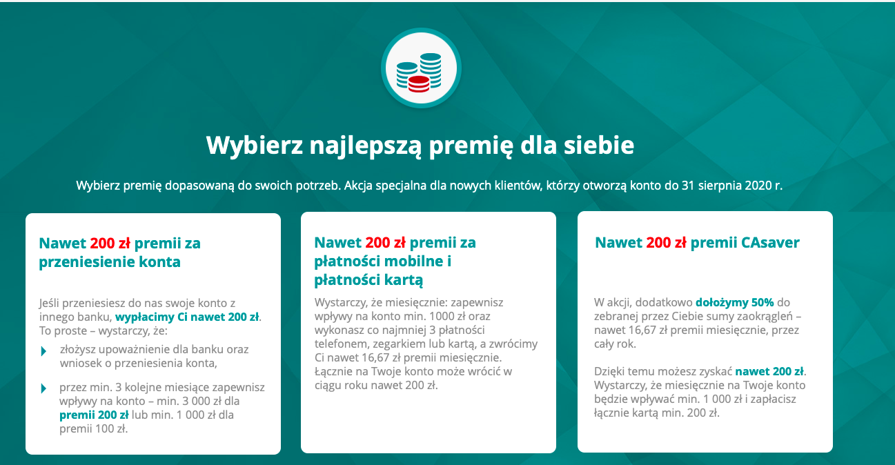 W zamian za przeniesienie konta, płatności bezgotówkowe lub zaokrąglenia od płatności kartą możesz zgarnąć nawet do 200 zł premii. Dostępna jest prawdziwa perełka dla oszczędzających: 3% na koncie oszczędnościowym!