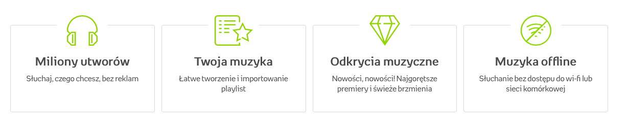 Korzystanie z wszystkich funkcjonalności usługi, w szczególności słuchanie bez ograniczeń pełnej długości utworów i albumów muzycznych, wymaga posiadania wykupionego abonamentu.