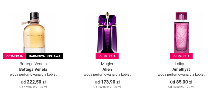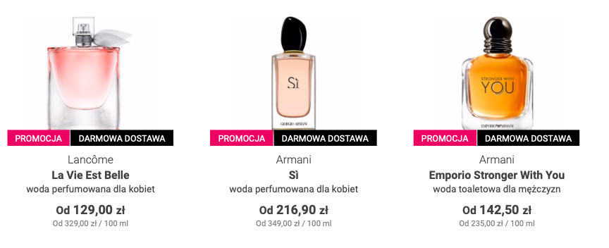 Zamów luksusowe perfumy lub kosmetyki od najlepszych światowych marek w kusząco niskich cenach. Co tydzień przygotowane dla Was nowe rabaty cenowe na perfumy, kosmetyki i popularne zestawy prezentowe. Korzystaj z promocji i kupuj kosmetyki i perfumy w niższych cenach!