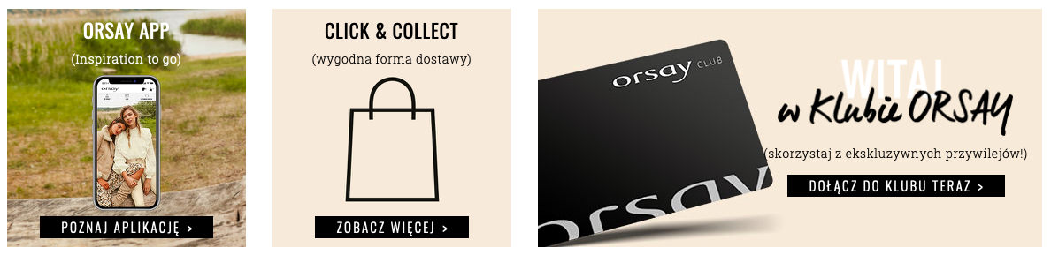 Sklep internetowy ORSAY jest dla kobiet, których ubiór pełni ważną rolę w wyrażaniu własnego stylu. W ofercie prezentuje bogaty wybór ubrań oraz dodatków w przystępnych cenach. Kolekcje łączą ze sobą aktualne trendy, modne sylwetki oraz ciekawe dodatki. Od idealnie dopasowanych jeansów po eleganckie stroje biurowe, piękne sukienki oraz akcesoria na imprezę lub wesele. Ubrania sprawiją, że będziesz wyglądała dobrze niezależnie od okazji. W sklepie online znajdziesz wszystko, czego pragnie Twoje modowe serce.